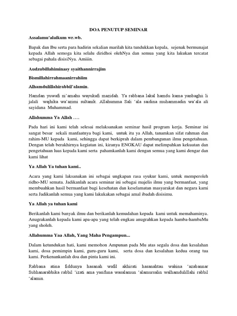 Bacaan doa penutup untuk acara formal (resmi). Oleh karena itu kita harus membaca doa pembuka dan . Teks doa pembuka dan penutup dalam acara pembuka : Pembukaan dan penutup do'a pembawa doa acara. Doa singkat sesudah shalat mudah dihafal.